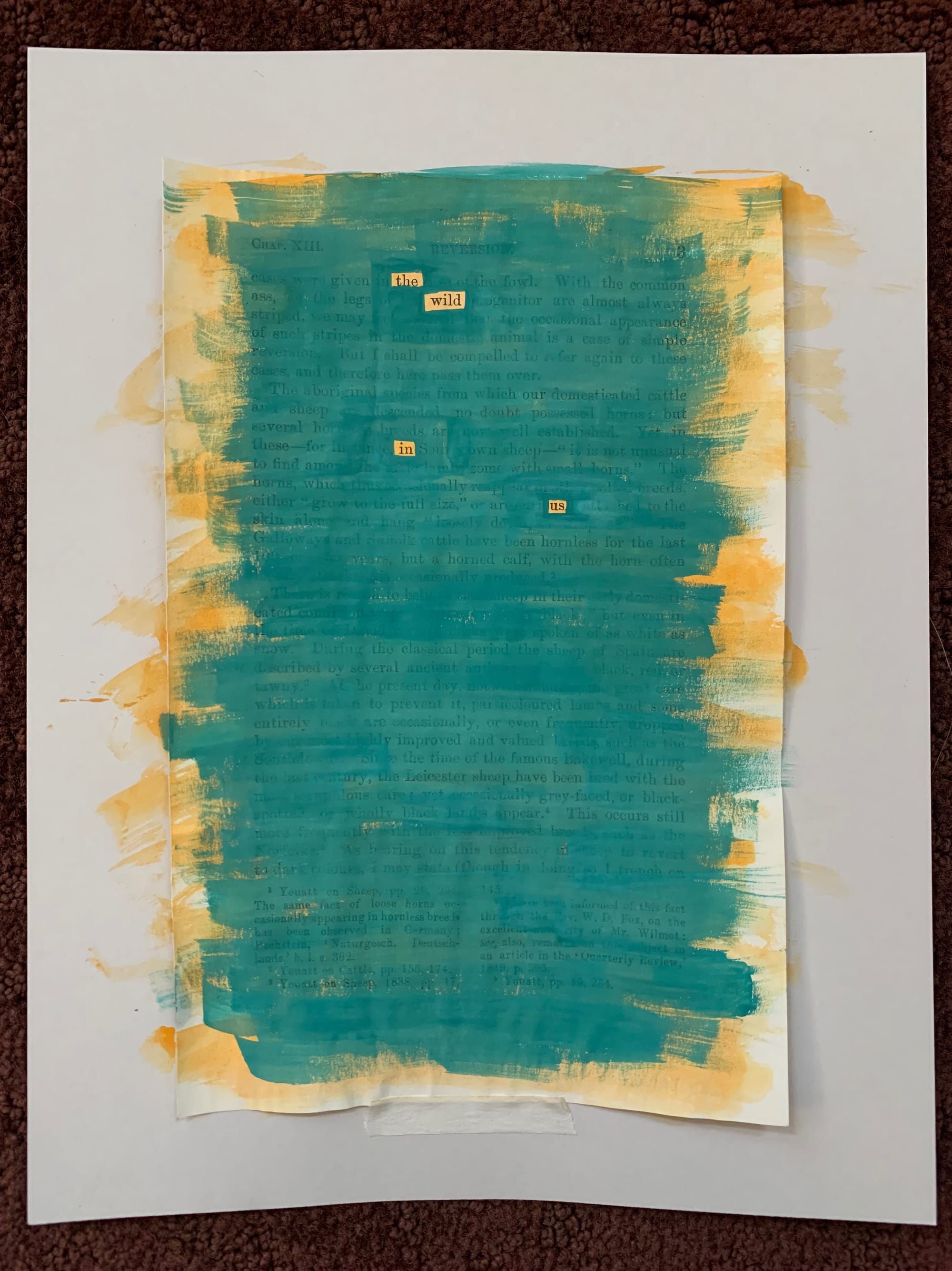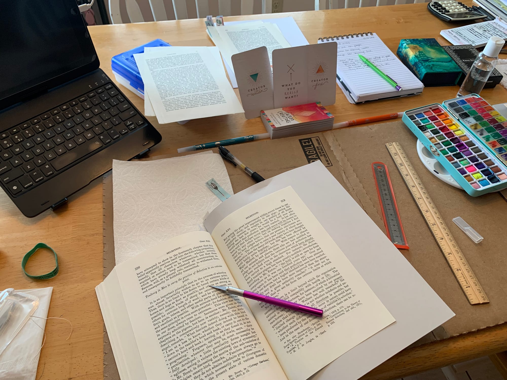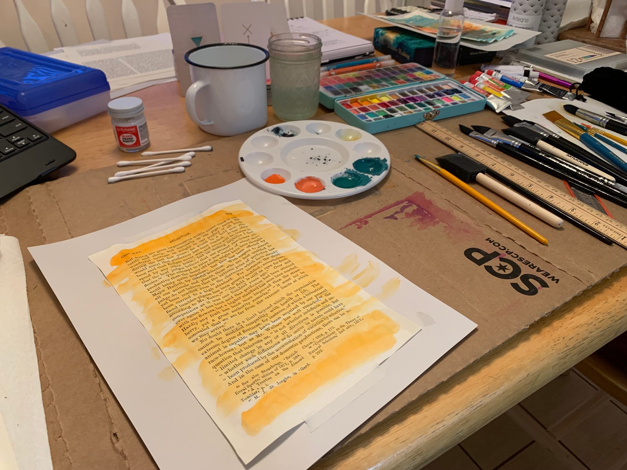 In this stage of the process, the pages I used for the project were removed from the book, then painted first with a layer of orange watercolor paint, then a custom-mixed shade of blue/green. This was my workstation, complete with oracle cards drawn to select colors for the poems.