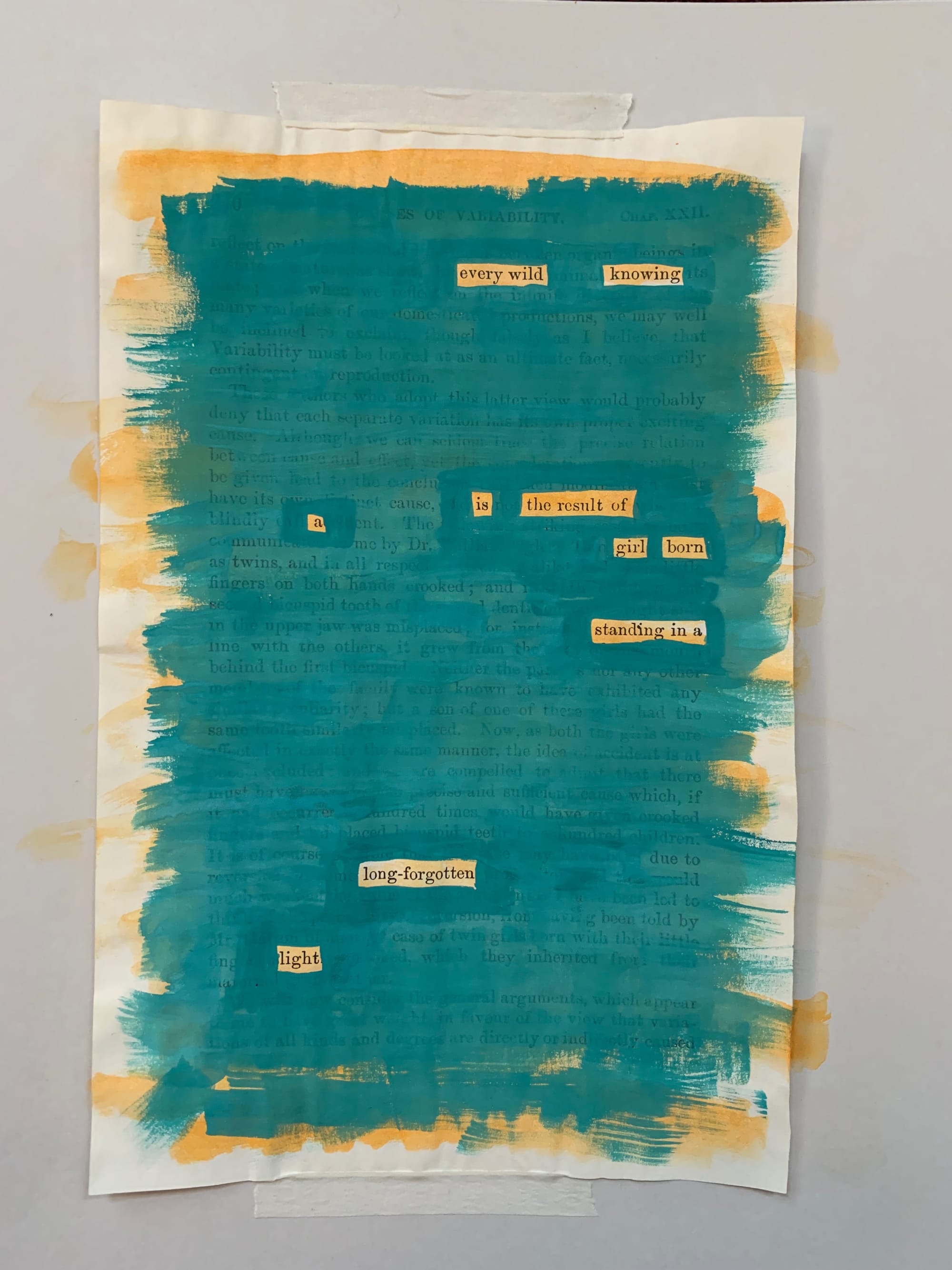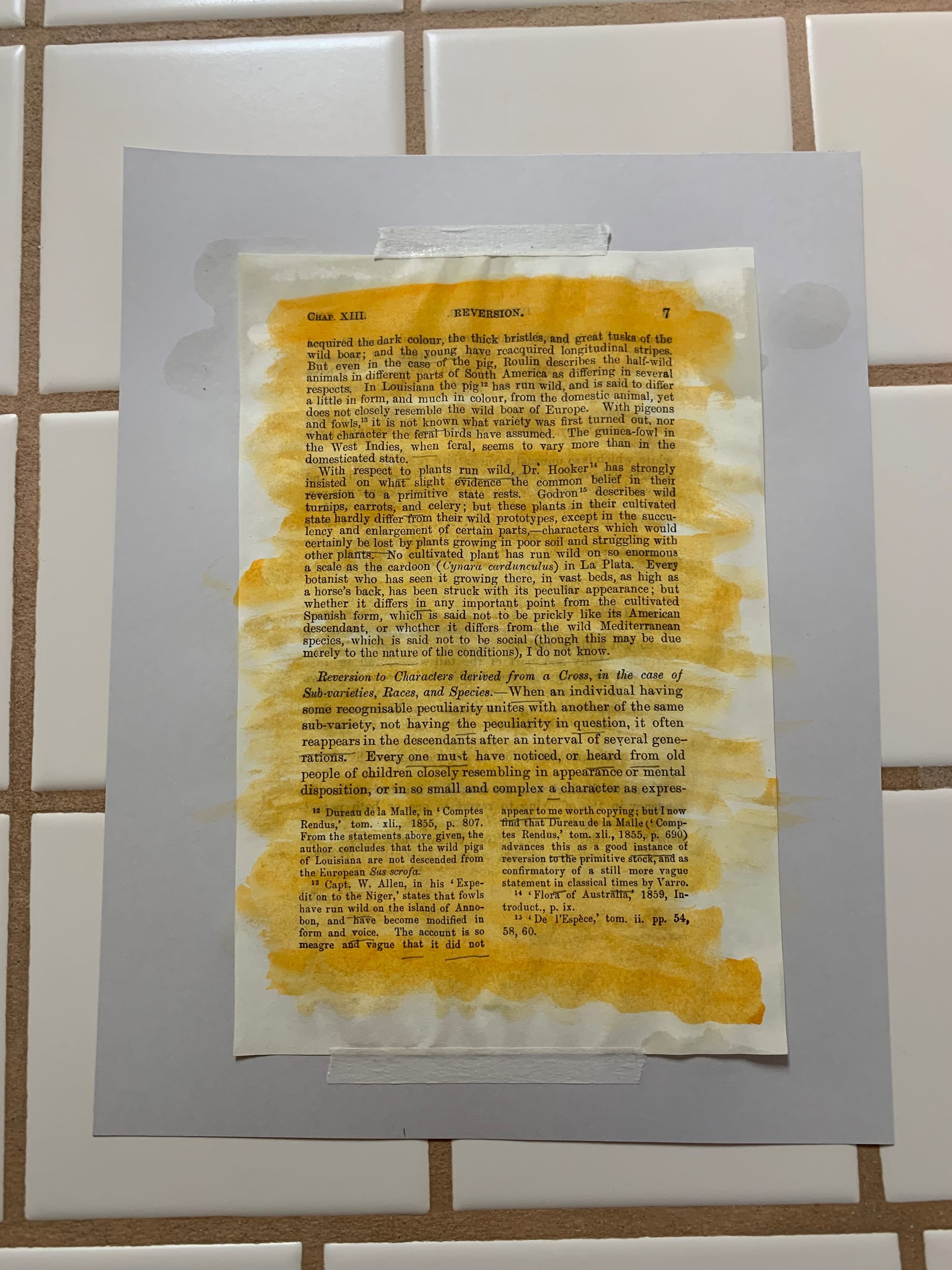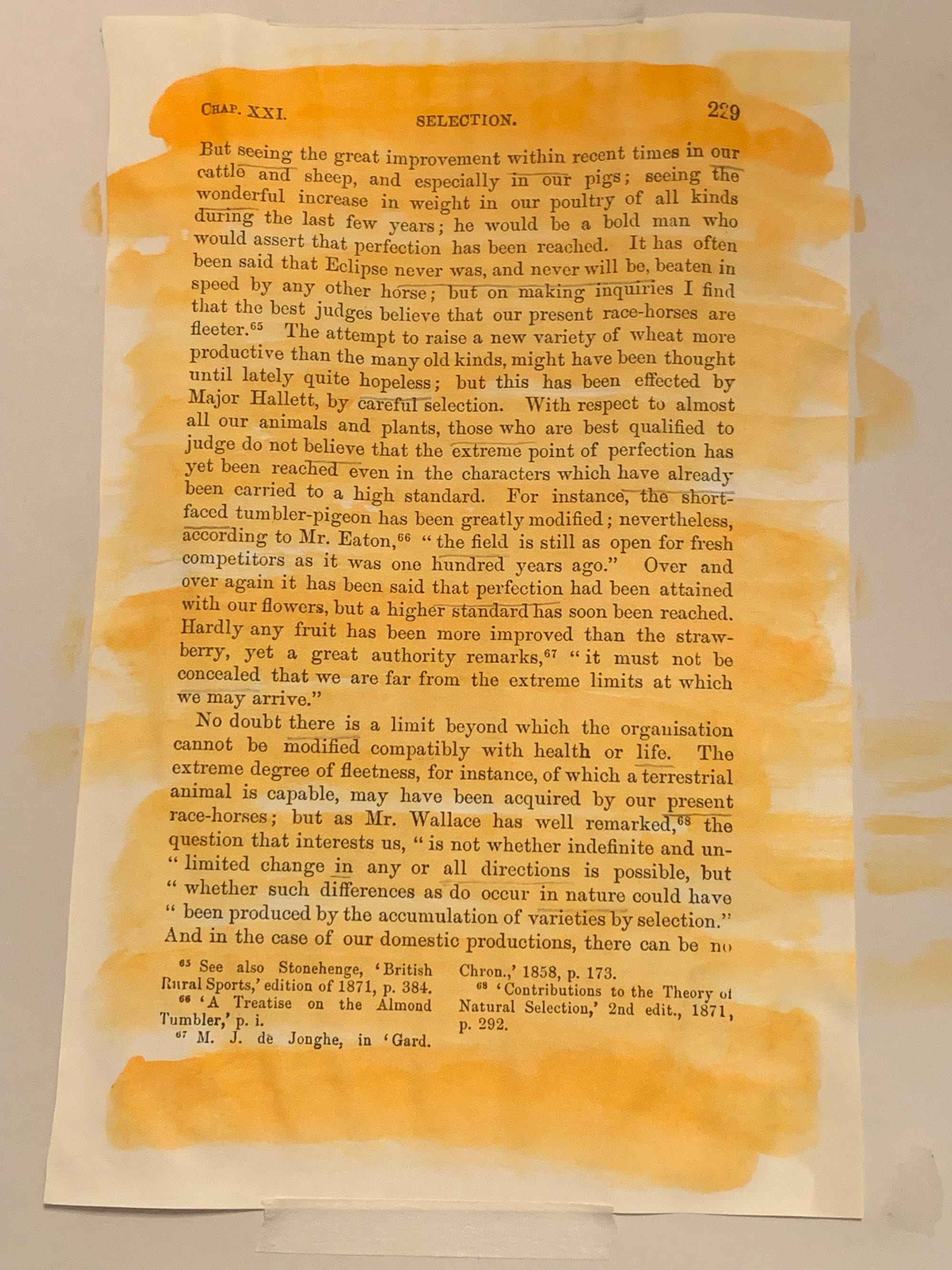 In this collection of ten erasure poems, I used a formal system of constraint in which I created poems using only the text available on the page. The text surrounding the words I selected for each poem was "erased" using watercolor paints. This process enabled each poem to stand out from the page, becoming a new piece of art. The poems use as a source, Charles Darwin's, The Variation of Animals and Plants Under Domestication: Volume Two.